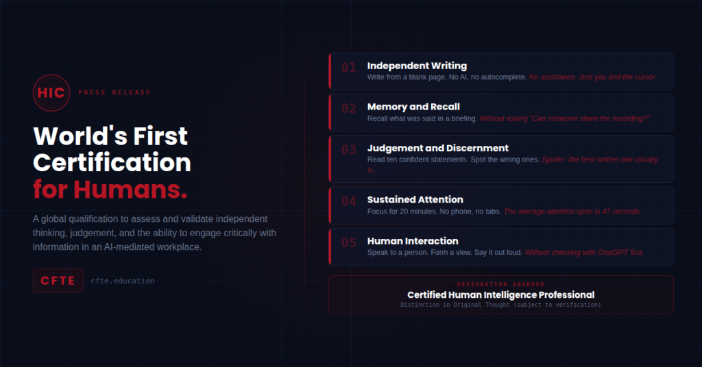 LONDON, 1 April 2026. The Centre for Finance, Technology and Entrepreneurship (CFTE) today announced the launch of the Human Intelligence Certification (HIC), a new global qualification designed to assess and validate professionals’ ability to think independently in an increasingly AI-mediated workplace.